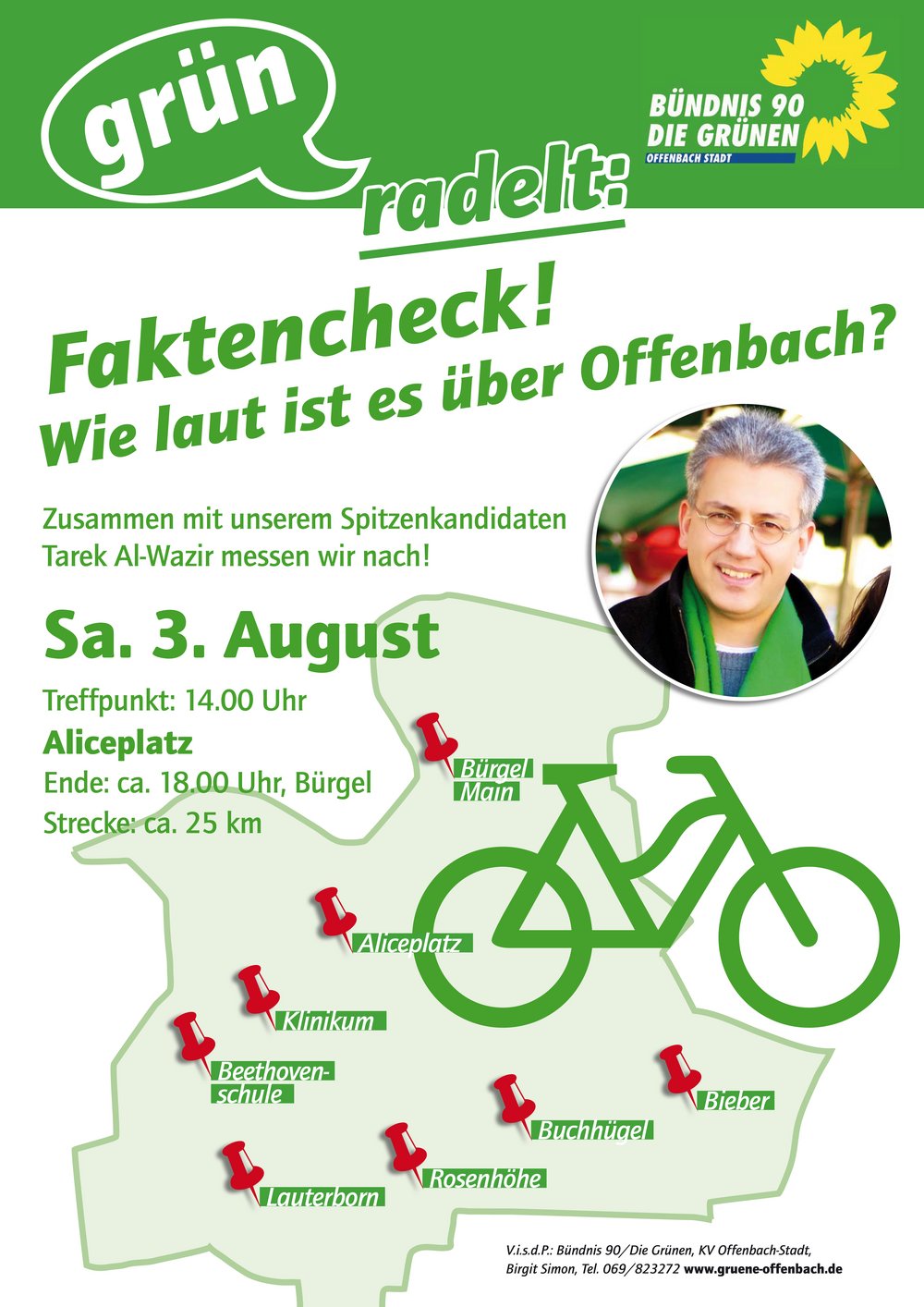 Wie laut es wirklich über Offenbach ist, wollen die Grünen während einer Fahrradtour mit ihrem Spitzenkandidaten Tarek Al-Wazir durch Offenbach überprüfen. An unterschiedlichen Haltepunkten wird der jeweiligen Lärmpegel der Flugzeuge über Offenbach vor Ort nachgemessen. Der Weg führt zum Klinikum, zur Beethovenschule, vom Lauterborn zur Rosenhöhe, über den Buchhügel nach Bieber und endet mit einem kleinen Umtrunk in Bürgel am Main.