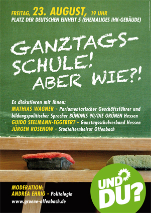 Neben Mathias Wagner, dem parlamentarischen Geschäftsführer und bildungspolitischen Sprecher der Grünen Landtagsfraktion in Hessen, werden auch Guido Seelmann-Eggebert, Vorsitzender des hessischen Ganztagsschulverbandes, Jürgen Rosenow vom Stadtelternbeirat Offenbach über ihre Vorstellungen von Ganztagsschule diskutieren und darüber was die Grünen auf Landesebene durchsetzen wollen. In Offenbach bieten zurzeit nur einige Schulen einzelne gebundene Ganztagsklassen bis weit in den Nachmittag hinein.