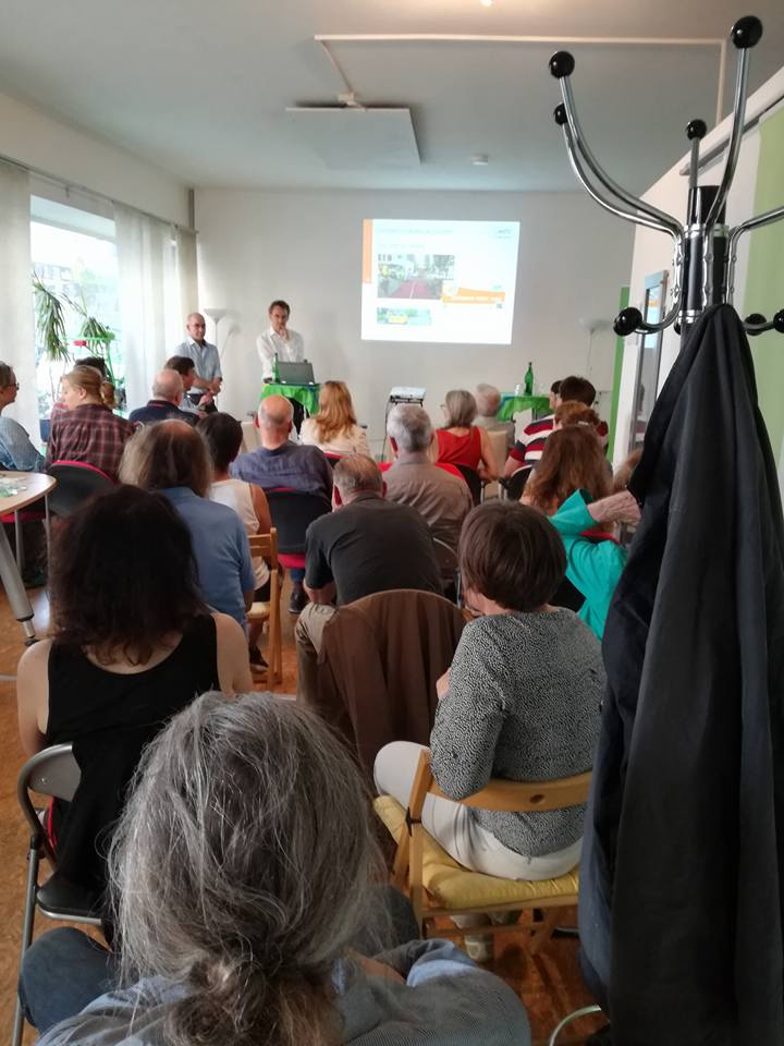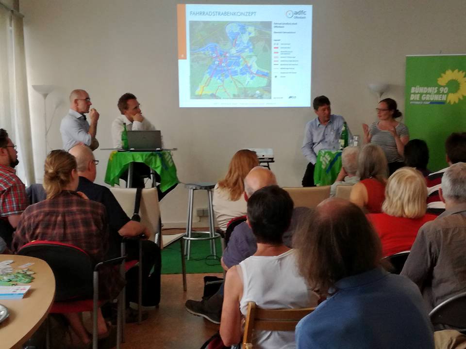Bei der Vorstellung der Pläne entwickelte sich eine rege Diskussion zwischen den knapp 40 Zuhörern in der Grünen-Geschäftsstelle in der Domstraße, darunter auch der Grüne OB-Kandidat Peter Schneider und Annika Busch-Geertsema, die sich seit 2010 an der Uni Frankfurt wissenschaftlich mit Fahrradmobilität beschäftigt. Peter Schneider betonte, Offenbach wachse jährlich um rund 2500 Einwohner. Würden alle auf das Auto setzen, reiche das vorhandene Straßennetz nicht aus „und neue Straßen zur Entlastung werden wir nicht bauen.“ Mit dem erhofften Bau von Fahrradstraßen steht das Fahrrad als gleichberechtigtes Verkehrsmittel in Offenbach erst am Anfang. Deutlich wurde in der Diskussion, dass beispielsweise auch an überdachte Abstellplätze in der Innenstadt notwendig sind, um das Fahrradfahren in der Stadt attraktiver zu machen. „Infrastruktur für den Radverkehr erhöht den Radverkehrsanteil und macht die Stadt lebenswerter“, sagte Ulrich Lemke. Damit das Fahrrad seinen Stellenwert als umweltfreundliches (und gesundes) Verkehrsmittel auch im öffentlichen Bewusstsein einnehmen kann, sei eine intensive Öffentlichkeitsarbeit notwendig – vor allem beim autofahrenden Teil der Bevölkerung. Dass dies keine Utopie ist, verdeutlichte Annika Busch-Geertsema mit Blick auf die deutsche Fahrradstadt Münster. Dort habe das Fahrrad allerdings eine lange Tradition als gleichberechtigtes Verkehrsmittel. „Ich finde es aber beeindruckend, wie Offenbach versucht, diese Entwicklung hier anzustoßen“, sagte sie. Doch nicht nur Überzeugungsarbeit wird notwendig sein, um Offenbach zu einer Fahrradstadt zu entwickeln. In der Diskussion nahm auch die notwendige Finanzierung einen großen Teil der Debatte ein. Am Ende formulierte Peter Schneider die entscheidenden Worte: „Die Finanzierung der Fahrradstraßen muss Sache der Kommune sein, und ich denke, das kriegen wir hin.“