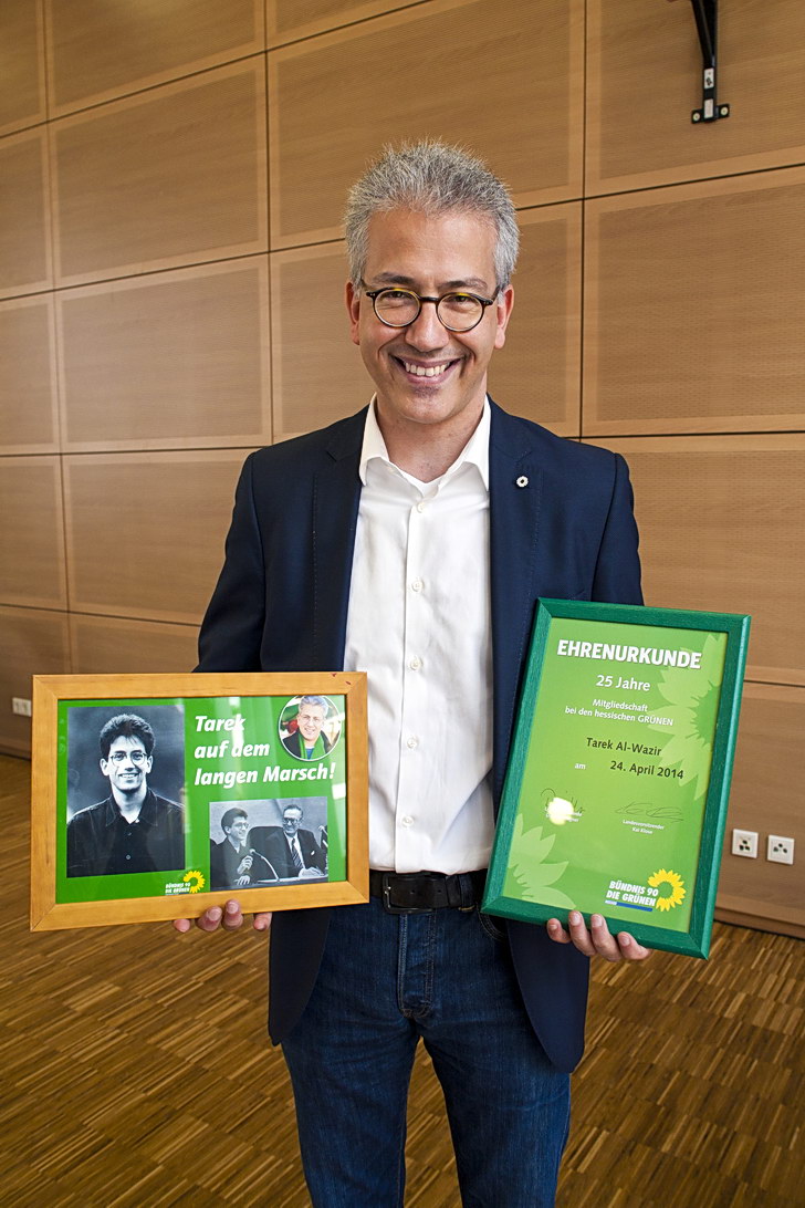 „Das habe ich ja völlig vergessen!“ Das glaubt man dem Hessischen Wirtschaftsminister Tarek Al-Wazir gern angesichts seines verdutzten Gesichtsausdrucks, als Offenbachs Grünenvorsitzende Birgit Simon ihm die Urkunde zur 25-jährigen Mitgliedschaft überreicht. Al-Wazir hatte die Ehrung langjähriger Mitglieder als ehemaliger Landesvorsitzender selbst erfunden und damals noch gescherzt, dass er eines Tages selbst so eine Urkunde bekommen werde. Gestern musste er aber zugeben: „Ich bin schon ein bisschen gerührt.“