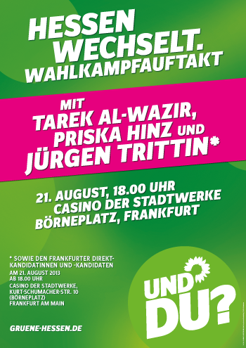 Am Mittwoch, dem 21. August ab 18 Uhr findet der offizielle Wahlkampfauftakt der hessischen Grünen in Frankfurt statt. Dabei sein werden neben Jürgen Trittin auch die hessischen Spitzenkandidatinnen und -kandidaten Priska Hinz, Omid Nouripur, Angela Dorn und Tarek Al-Wazir. Die Offenbacher Grünen bieten allen Interessierten eine gemeinsame Hinfahrt per S-Bahn zum Casino der Frankfurter Stadtwerke, Kurt-Schumacher-Str. 10, in Frankfurt an. Treffpunkt ist um 17.30 Uhr an der S-Bahnstation Marktplatz vor dem Kartenautomat auf der B-Ebene.