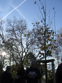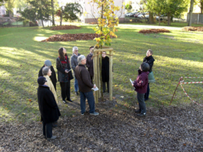Die Hainbuche war bereits von der Gärtnerei gesetzt und so war es ein zeremonieller Akt, mit dem Bündnis90/Die Grünen ihren zweiten Protestbaum gegen Fluglärm dieses Jahr an der Beethovenschule eingeweiht haben. Anlässlich des zweiten Jahrestages seit Eröffnung der Landebahn Nordwest erzürnt Frank Leithäuser von den Grünen vor allem die Ohnmacht gegenüber den Entscheidern, die selbst nicht von den Folgen ihres Handelns betroffen sind. So fordert auch eine Resolution der Grünen an eine neue Regierung endlich zwingende Maßnahmen zur Lärmreduktion – neben einer Beteiligung der Öffentlichkeit bei der Festlegung von Flugrouten vor allem klare gesetzliche Richtlinien in Bezug auf Lärmobergrenzen. Ein Situationsbericht der Künstlerin Michaela Haas, verlesen von der Stadtverordneten Ursula Richter, zeichnet die aktuelle Stimmung vieler Offenbacher: „Ich habe Angst vor den immer wieder publizierten Gesundheitsstudien. Ich habe Angst vor Krebs, Angst davor, dass meiner Tochter durch Lärm und Abgase irreparable Schäden zugefügt werden. Ich habe Angst hier mein Leben zu verbringen und bin aber zu sehr hier angewachsen, mit unserem Haus, meiner Arbeit und allen Freundschaften, um mir vorstellen zu können, woanders hinzuziehen.“