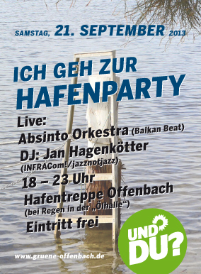 Offenbachs Grüne planen einen Tag vor der Wahl eine öffentliche Party an der Hafentreppe. Unter dem Motto „Samstag Party machen, Sonntag wählen gehen“ wollen sie noch einmal an das wichtige Recht der Bürgerinnen und Bürger erinnern, sich am Sonntag eine neue Regierung aussuchen zu dürfen.