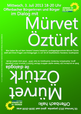 Die Grüne Landtagsabgeordnete Mürvet Öztürk bietet am 3. Juli eine Bürgersprechstunde in Offenbach an. Interessierte sind herzlich eingeladen ihre Anliegen vorzutragen und mit ihr ins Gespräch zu kommen. Die Bürgersprechstunde findet von 18 bis 20 Uhr im Stadtteilbüro Nordend am Goetheplatz statt.