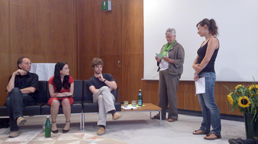 Wozu braucht eine Stadt bzw. unser Land Künstler? Nach einer Filmvorführung und ersten Ergebnissen einer Studie aus Württemberg, die sich mit dieser Thematik befasste, kam es zur eigentlichen Diskussion. Agnes Krummwiede, selbst künstlerisch ausgebildet und damit kompetente kulturpolitische Sprecherin der grünen Bundestagsfraktion, forderte mehr Respekt von der Gesellschaft gegenüber der Kunst. So wird das Potential zum Gestalten in der Bildung viel zu wenig gefördert, Künstler zählen zur ärmsten Berufsgruppe Deutschlands. Kulturförderung, die sich nicht an Ergebnissen misst, Krankengeld ab den 1. Tag, bundeseinheitliche Honoraruntergrenzen oder Zahlung für Ausstellungen sind einige ihrer Forderungen an den Bund.
