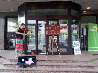 Knapp 20 Euro waren es, die sich im Körbchen der Geigenspielerin ansammelten, die vor dem alten IHK-Gebäude aufspielte. „Wovon sollen Künstler_Innen leben?“ lautete das Thema einer Veranstaltung von Bündnis 90/Die Grünen und die erste Antwort kam aus dem Publikum: „Ich lebe nicht von der Kunst, ich lebe für die Kunst!“ So war es auch die Diskrepanz zwischen kreativer Freiheit des Künstlers und dem Zwang, damit Geld verdienen zu müssen, die den Diskussionsabend mit rund 50 Teilnehmern beherrschte.