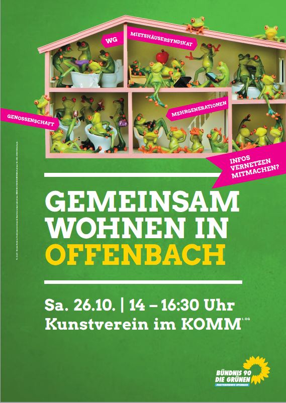 Gemeinsam wohnen in Offenbach findet statt am Samstag, den 26. Oktober 2019 ab 14 Uhr im Kunstverein im KOMM (1. OG). Aktuelle Informationen und die Möglichkeit zur Anmeldung gibt es unter www.gruene-offenbach.de/gemeinsam-wohnen-in-offenbach