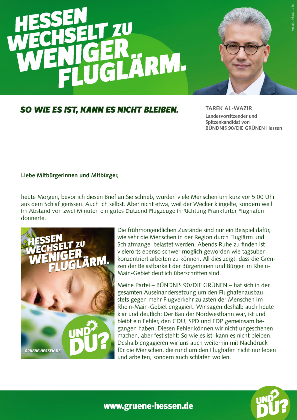Hierfür setzen sich meine Partei und auch ich persönlich ein. Deshalb möchte ich bei einer Regierungsbeteiligung der GRÜNEN als Wirtschafts- und Verkehrsminister für einen echten und fairen Interessenausgleich zwischen den betroffenen Bürgerinnen und Bürgern und dem wirtschaftlichen Betrieb sorgen. Ich werbe um neues Vertrauen, das die noch amtierende Regierung verspielt hat. Dafür brauche ich Ihre Unterstützung: Je stärker Sie sich für konsequenten Fluglärmschutz entscheiden, umso mehr unserer Forderungen können wir durchsetzen.