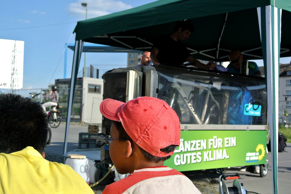 Die Fahrradwaschanlage selbst hatte sich um eine gute Stunde verspätet, weshalb einige Grüne Mitglieder erst einmal auf die altmodische Art ranmussten. Für den guten Zweck war das aber allen ein Vergnügen, denn der Tandemclub Offenbach ermöglicht es sehbehinderten, blinden und sehenden Menschen gemeinsam Sport zu treiben.